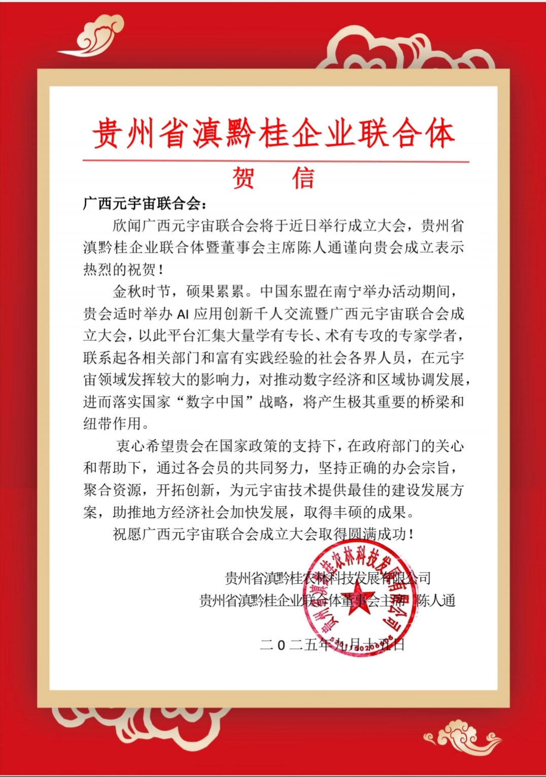 贵州省滇黔桂企业联合体 贺信